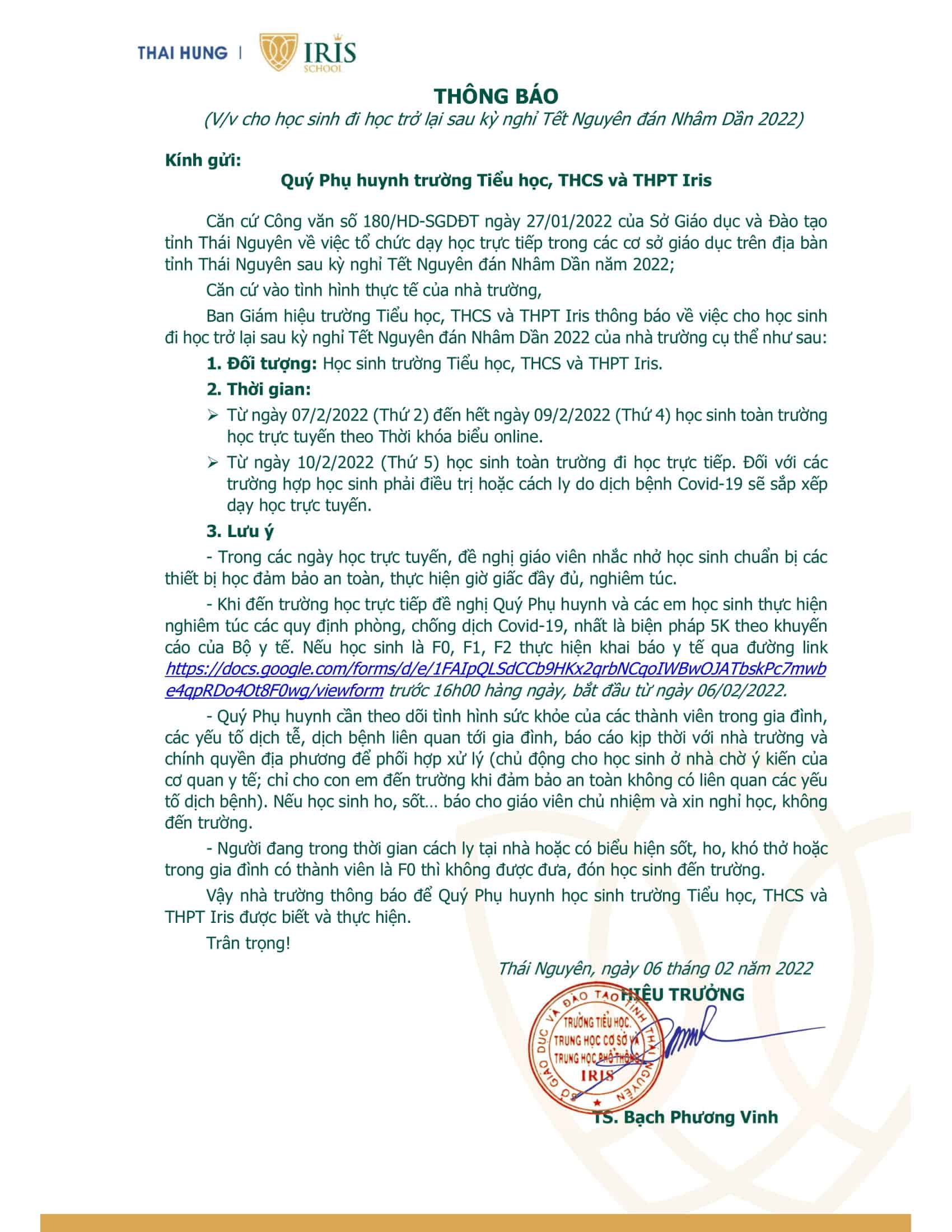 Căn cứ Công văn số 180/HD-SGDĐT ngày 27/01/2022 của Sở Giáo dục và Đào tạo tỉnh Thái Nguyên về việc tổ chức dạy học trực tiếp trong các cơ sở giáo dục trên địa bàn tỉnh Thái Nguyên sau kỳ nghỉ Tết Nguyên đán Nhâm Dần năm 2022 và tình hình thực tế của nhà trường, Ban Giám hiệu trường Tiểu học, THCS và THPT Iris thông báo về việc cho học sinh đi học trở lại sau kỳ nghỉ Tết Nguyên đán Nhâm Dần 2022 của nhà trường cụ thể như sau: