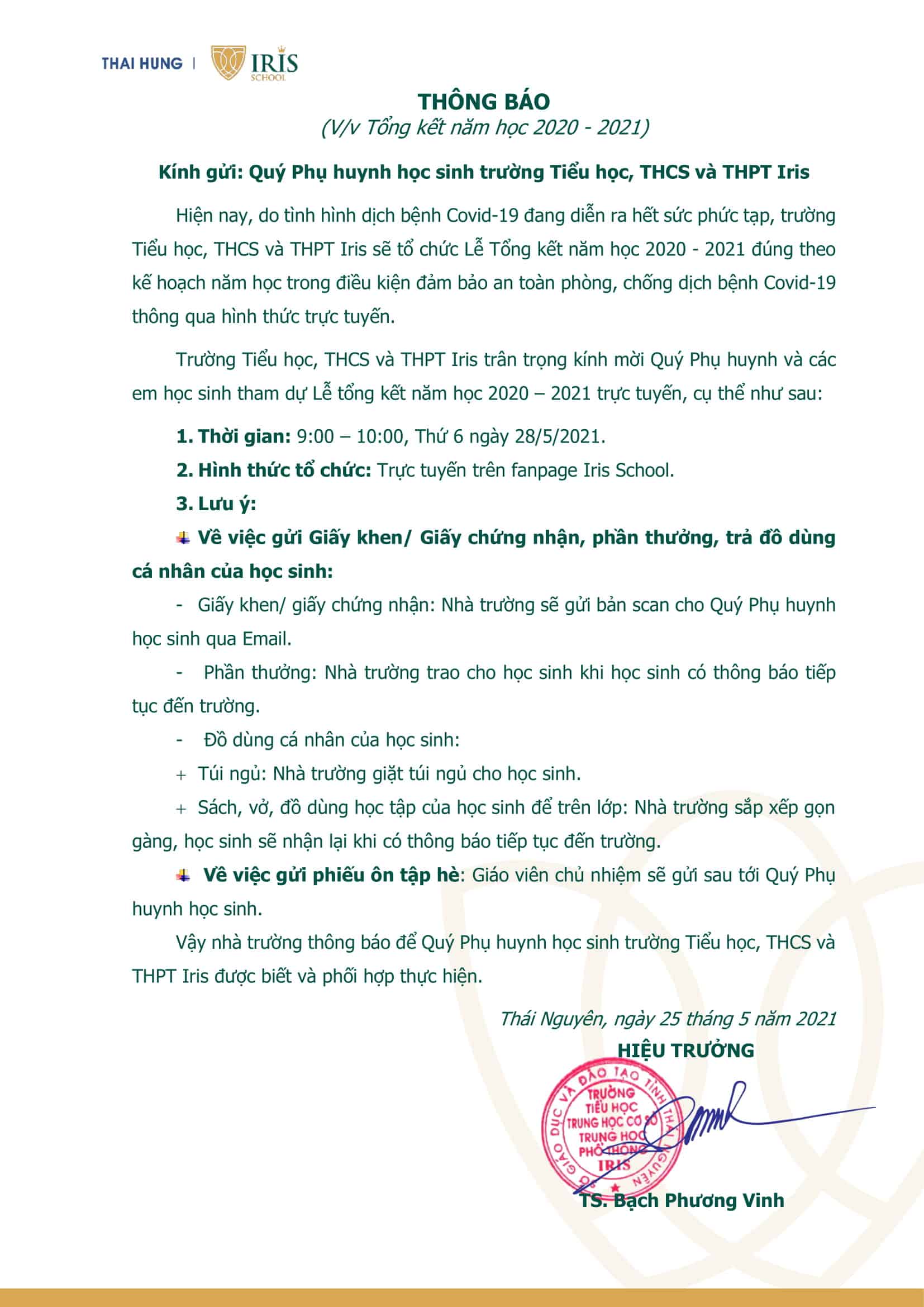 Do tình hình dịch bệnh Covid-19 diễn biến phức tạp, Trường Tiểu học, THCS & THPT Iris sẽ tổ chức Lễ Tổng kết năm học 2020 – 2021 đúng theo kế hoạch năm học trong điều kiện đảm bảo an toàn phòng, chống dịch bệnh thông qua hình thức trực tuyến.