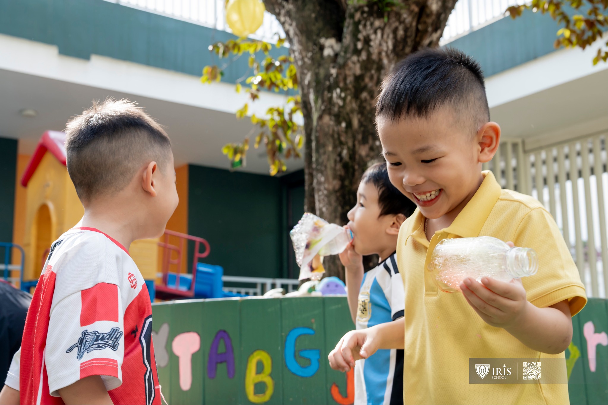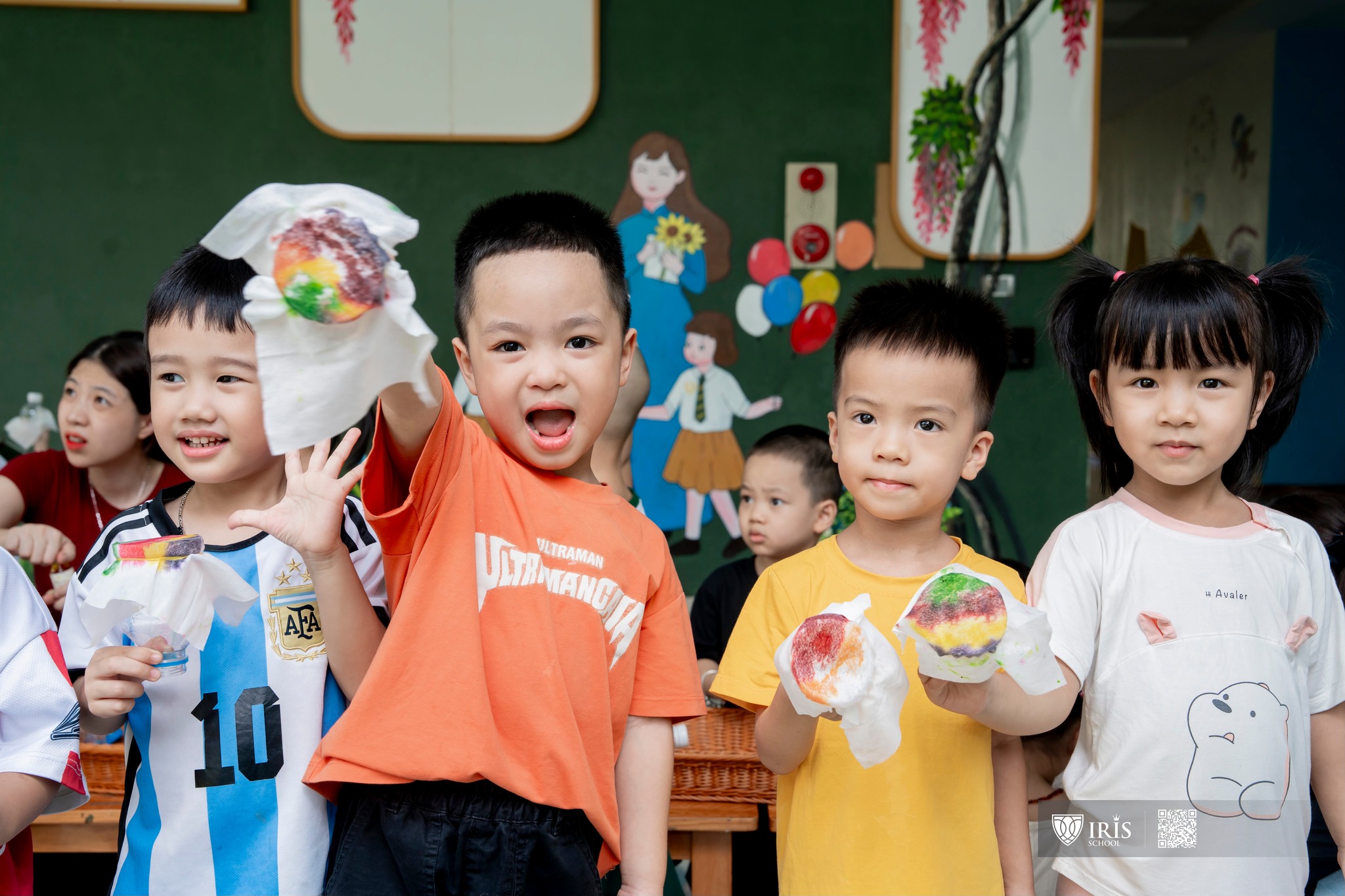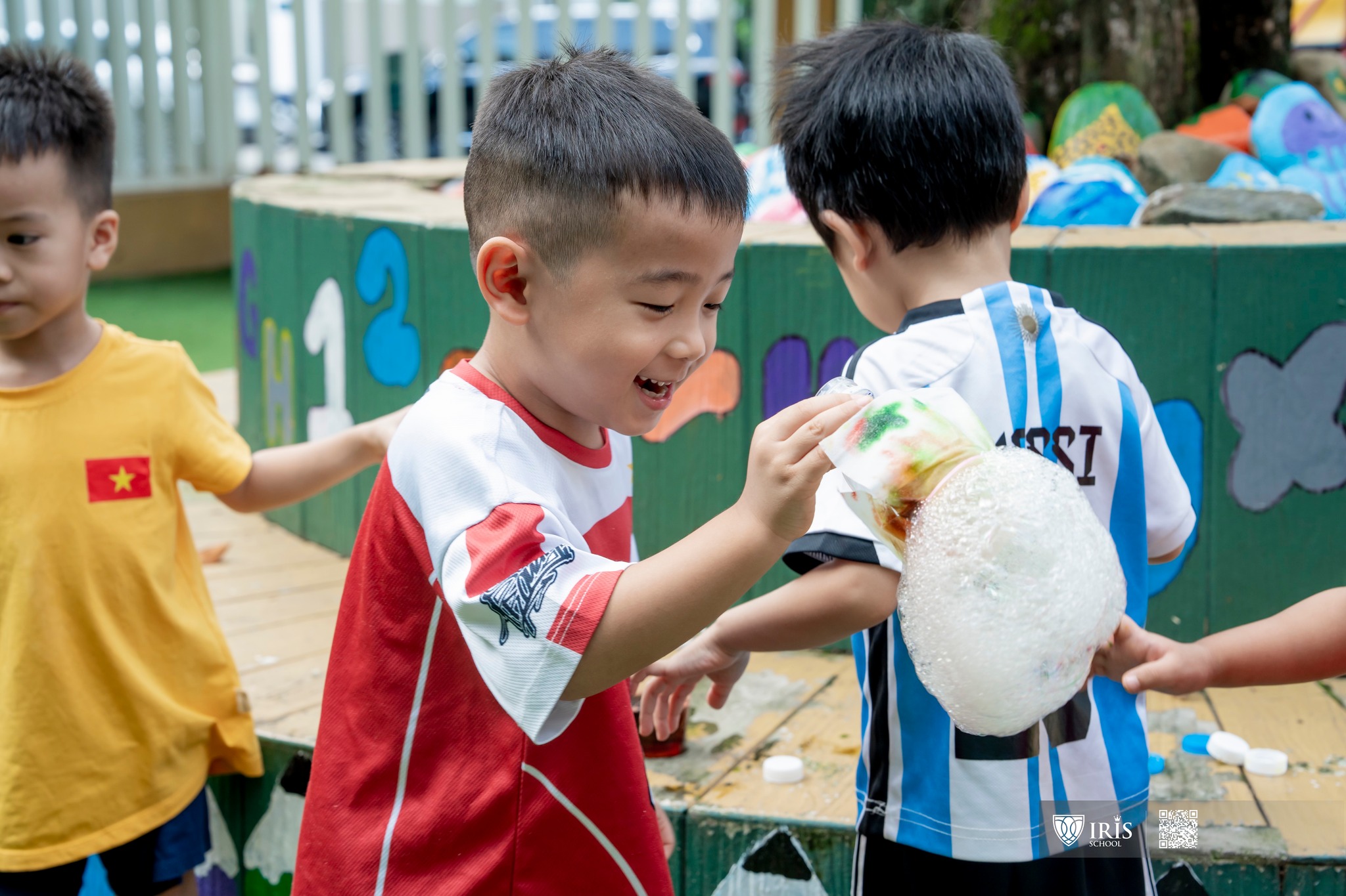 Trong giờ STEAM, các Irisers nhí đã cùng nhau biến những nguyên liệu quen thuộc như chai nhựa, giấy, màu thực phẩm, nước rửa bát và đường… thành một thí nghiệm khoa học đầy sắc màu – “Bong bóng cầu vồng”.