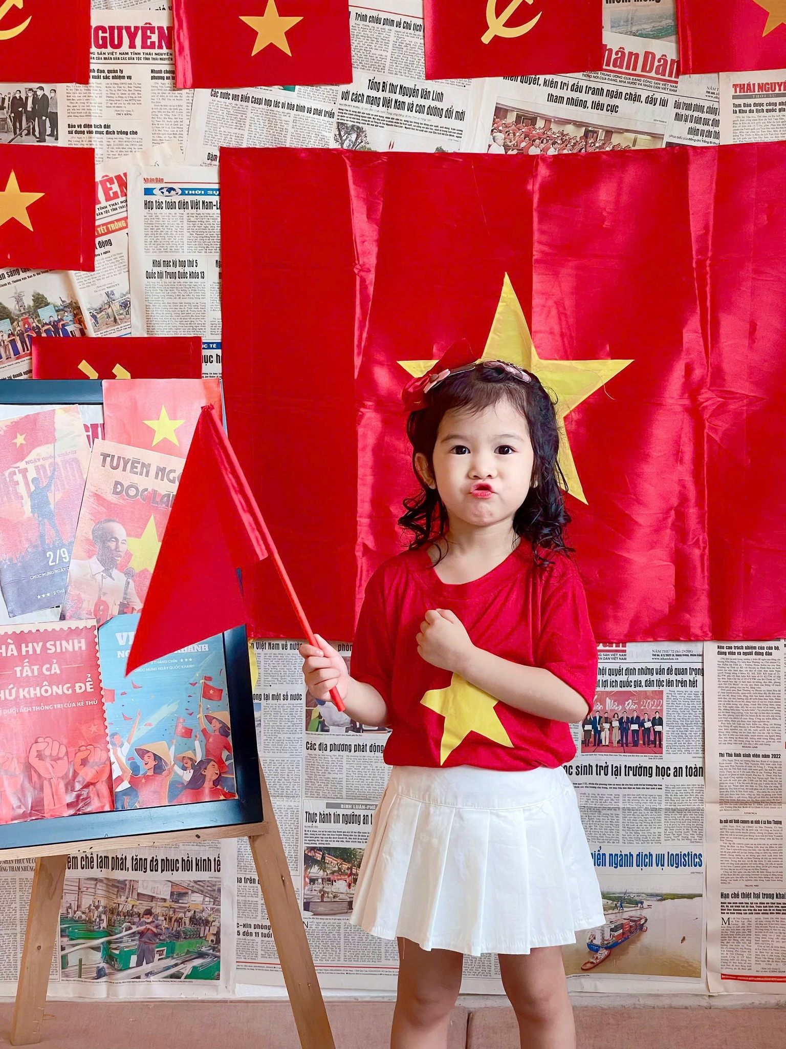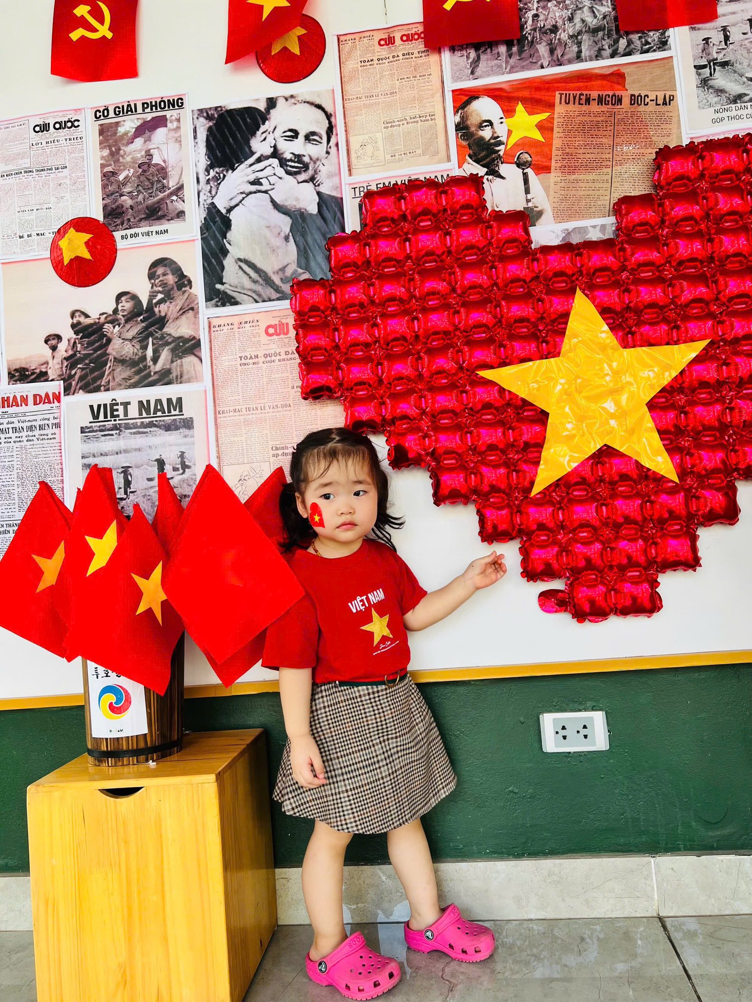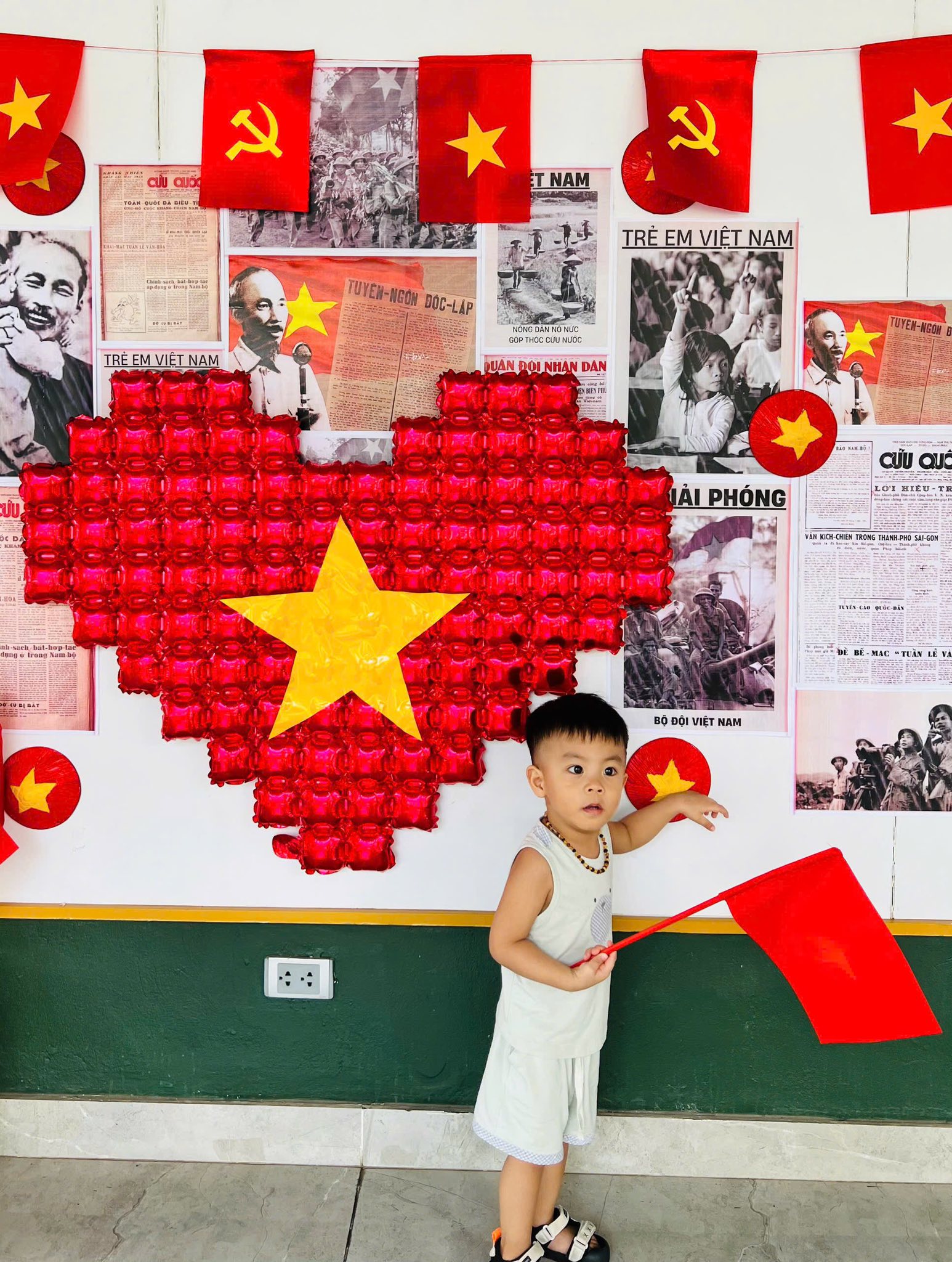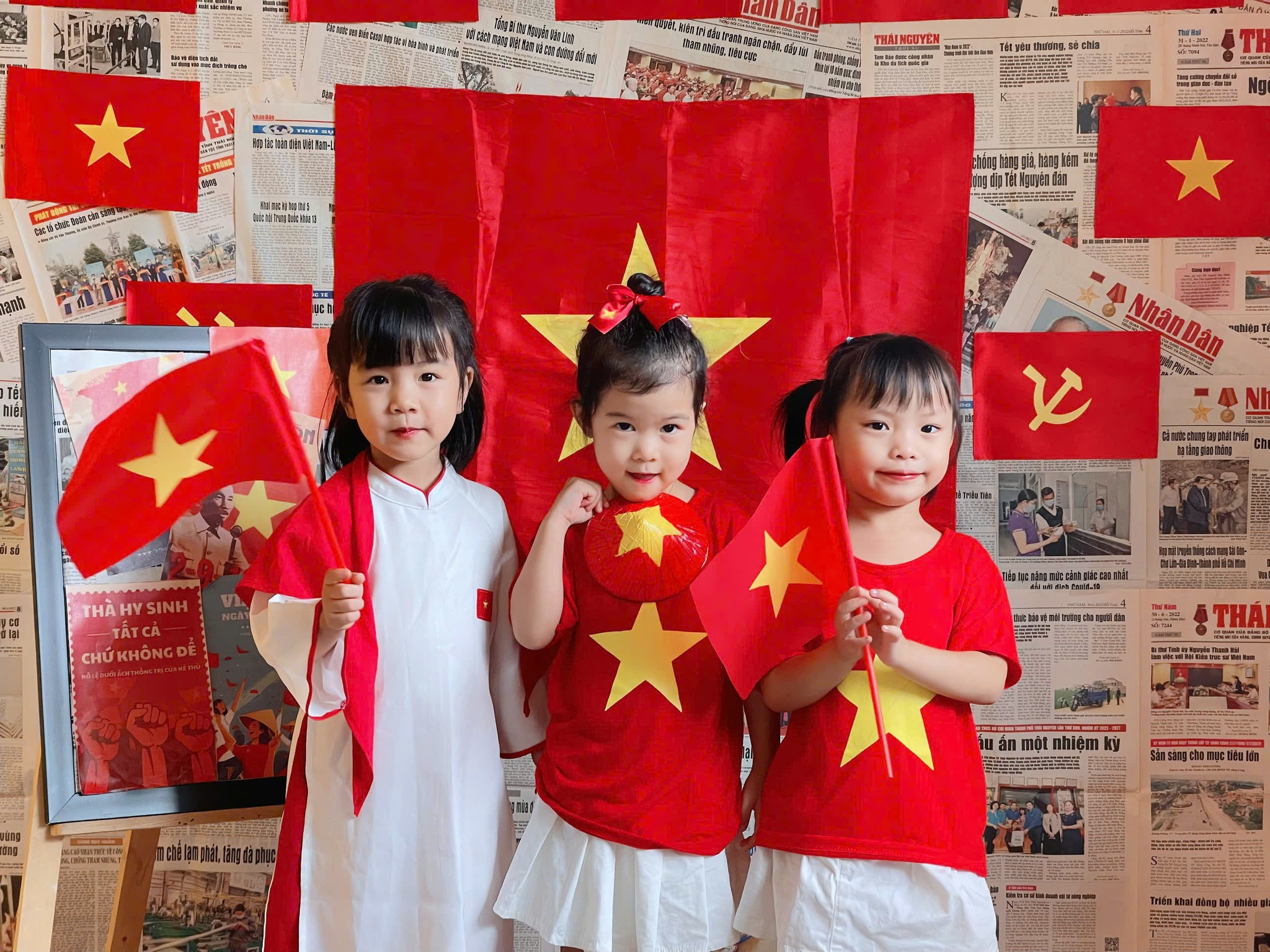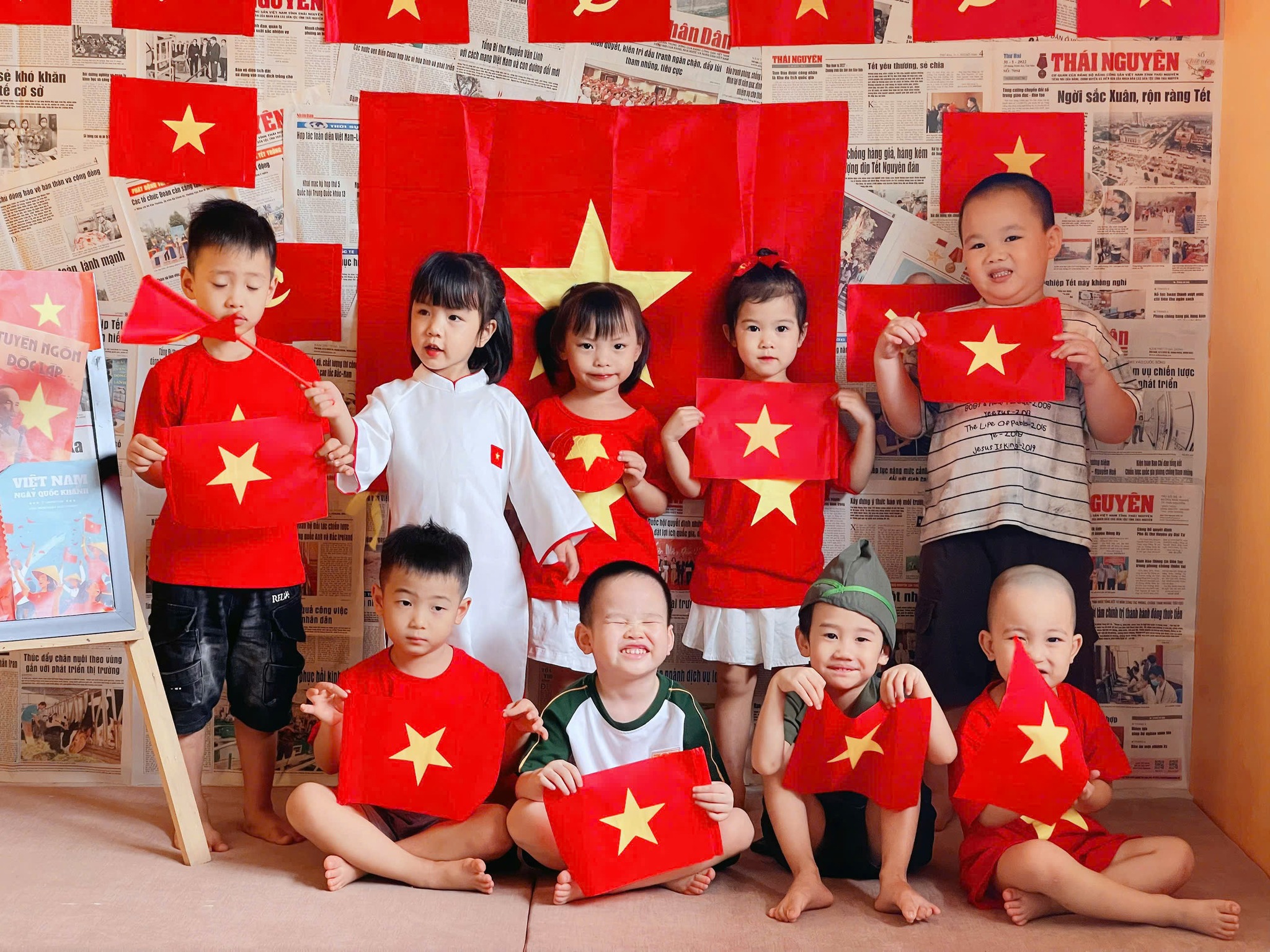 Trong màu áo đỏ sao vàng, các bạn nhỏ hào hứng tạo dáng bên không gian rực rỡ cờ hoa, pano, khẩu hiệu được các cô giáo chuẩn bị đầy tâm huyết. Hoạt động chụp ảnh tuy giản dị nhưng mang đến cho các con niềm vui và khơi gợi tình yêu quê hương, lòng tự hào dân tộc.