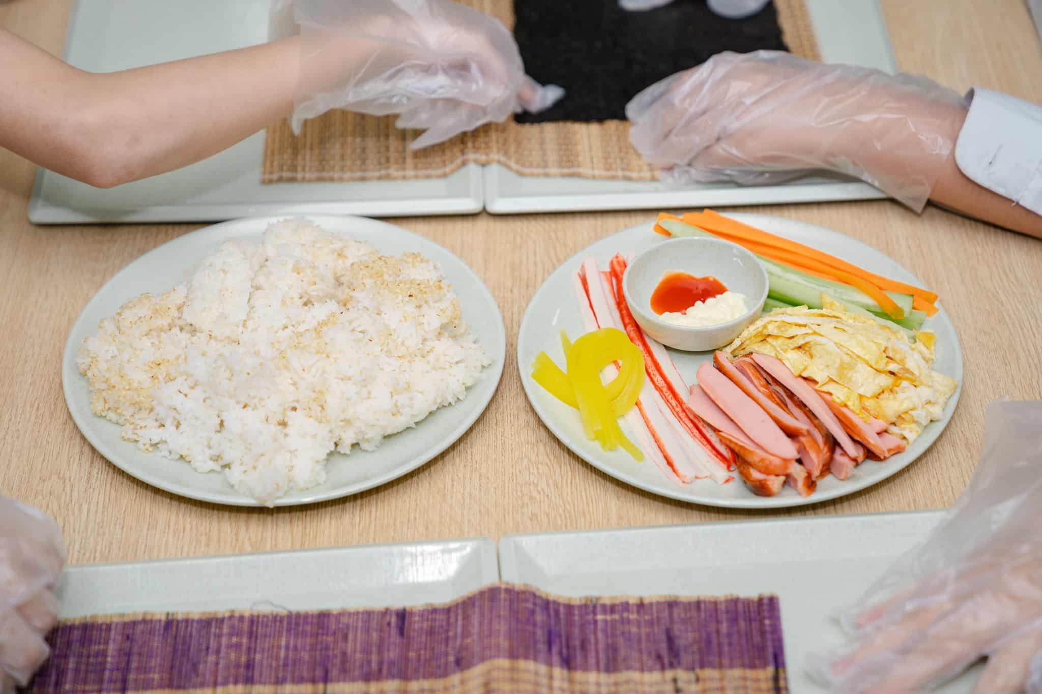 Sau khi chuẩn bị đầy đủ nguyên liệu gồm: Cơm, rong biển, dưa chuột, cà rốt, củ cải muối, xúc xích, thanh cua. Cô Thùy Linh đã hướng dẫn Irisers các bước hoàn thiện món Kimbap. Bằng những nguyên liệu quen thuộc, qua bàn tay khéo của mình, các bạn đã cùng nhau hoàn thành những cuộn kimbap vô cùng xinh xắn.