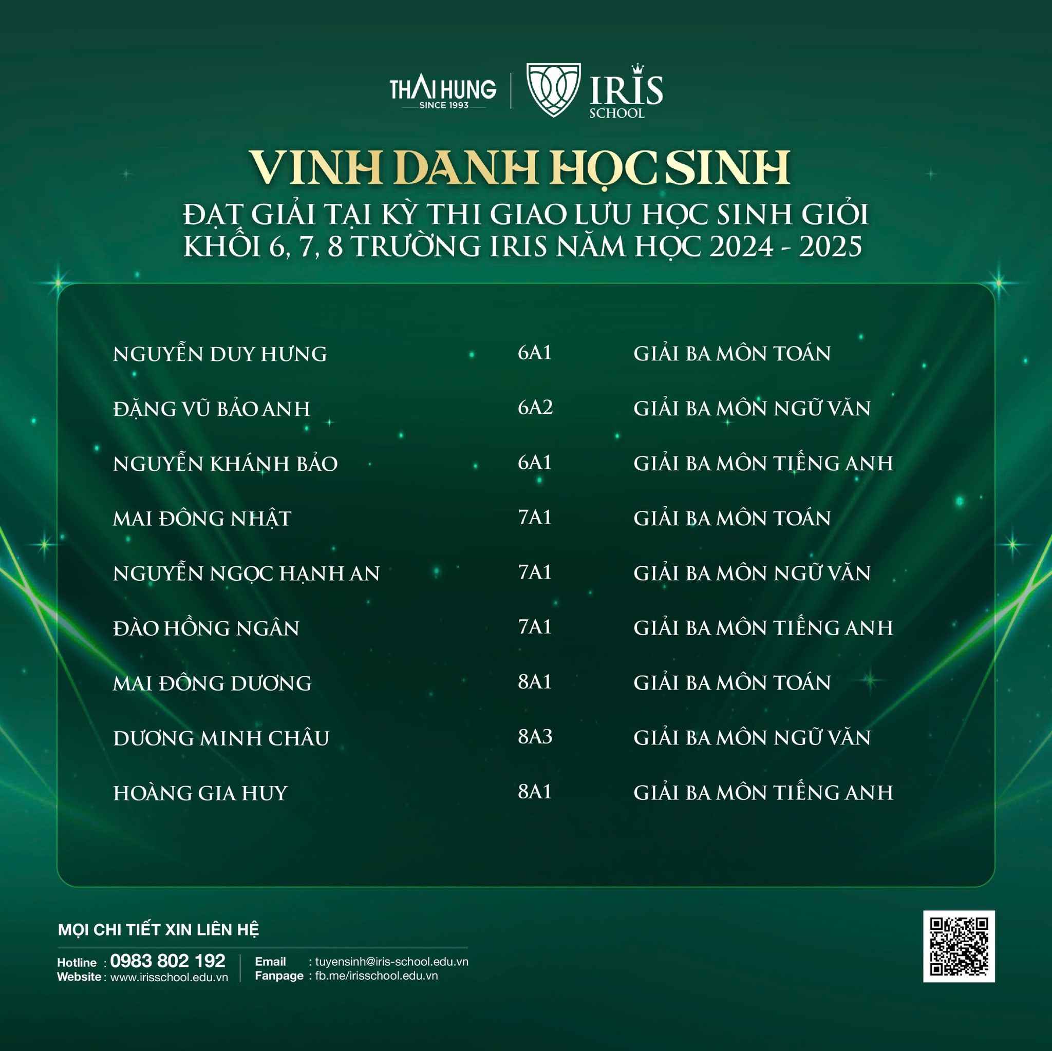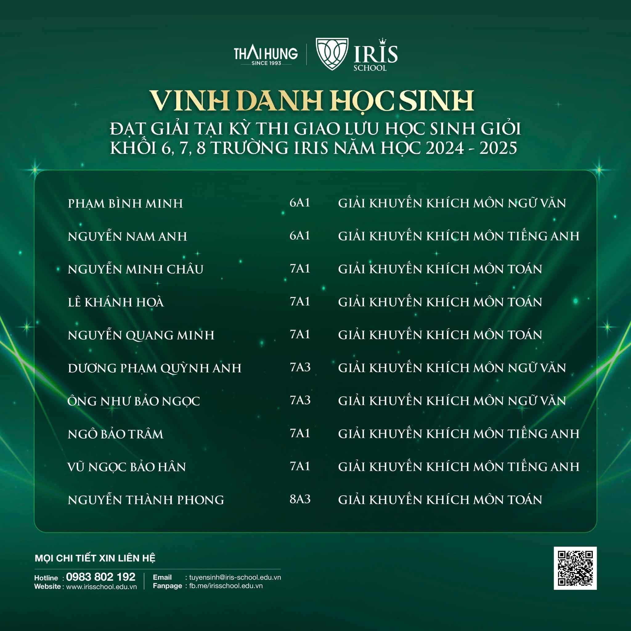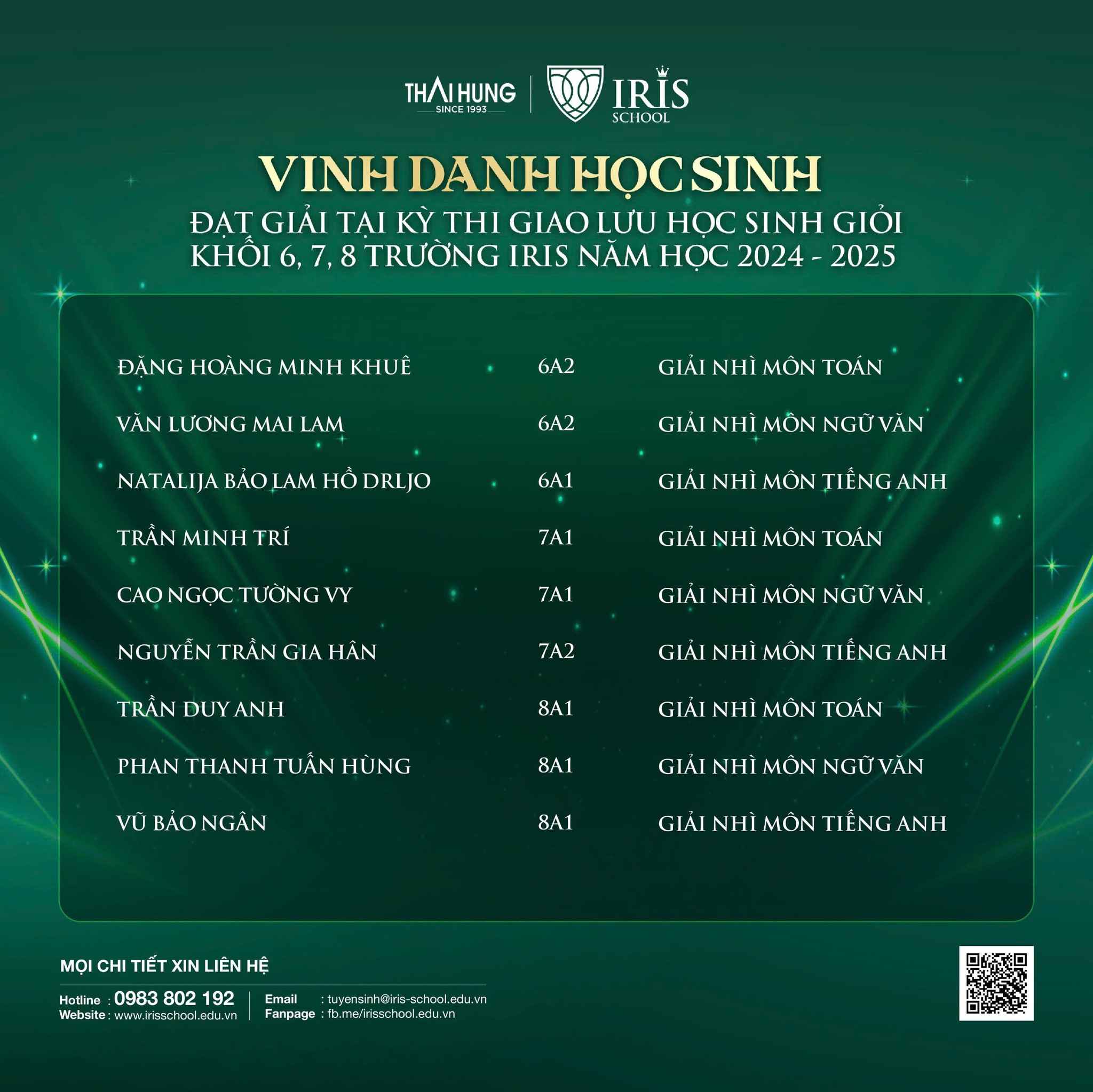 Nhà trường xin được gửi lời chúc mừng đến tất cả Irisers đã đạt giải cao trong kỳ thi. Mong rằng, đây sẽ là bước đệm quý giá để các con tiếp tục tự tin đến với những kỳ thi tiếp theo, không ngừng phát triển và tỏa sáng trên hành trình chinh phục tri thức của mình.