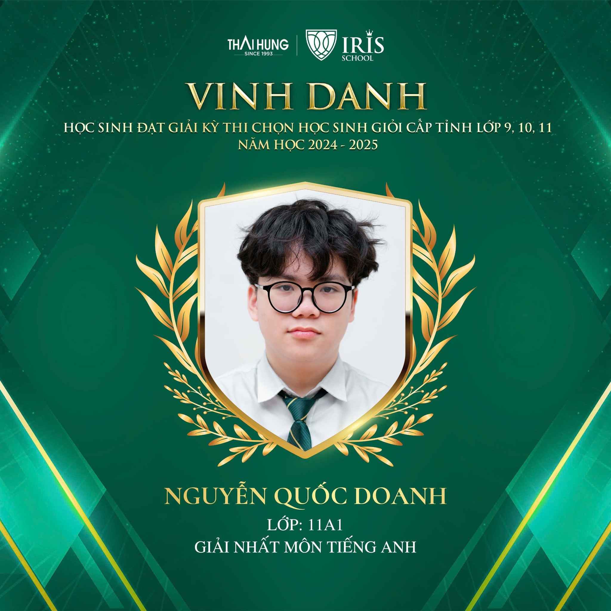Đặc biệt, xin chúc mừng bạn Nguyễn Quốc Doanh – Lớp 11A1 đã xuất sắc giành giải Nhất môn Tiếng Anh – một thành tích đáng tự hào, thể hiện sự bản lĩnh, kiến thức sâu rộng và sự nỗ lực không ngừng của con.